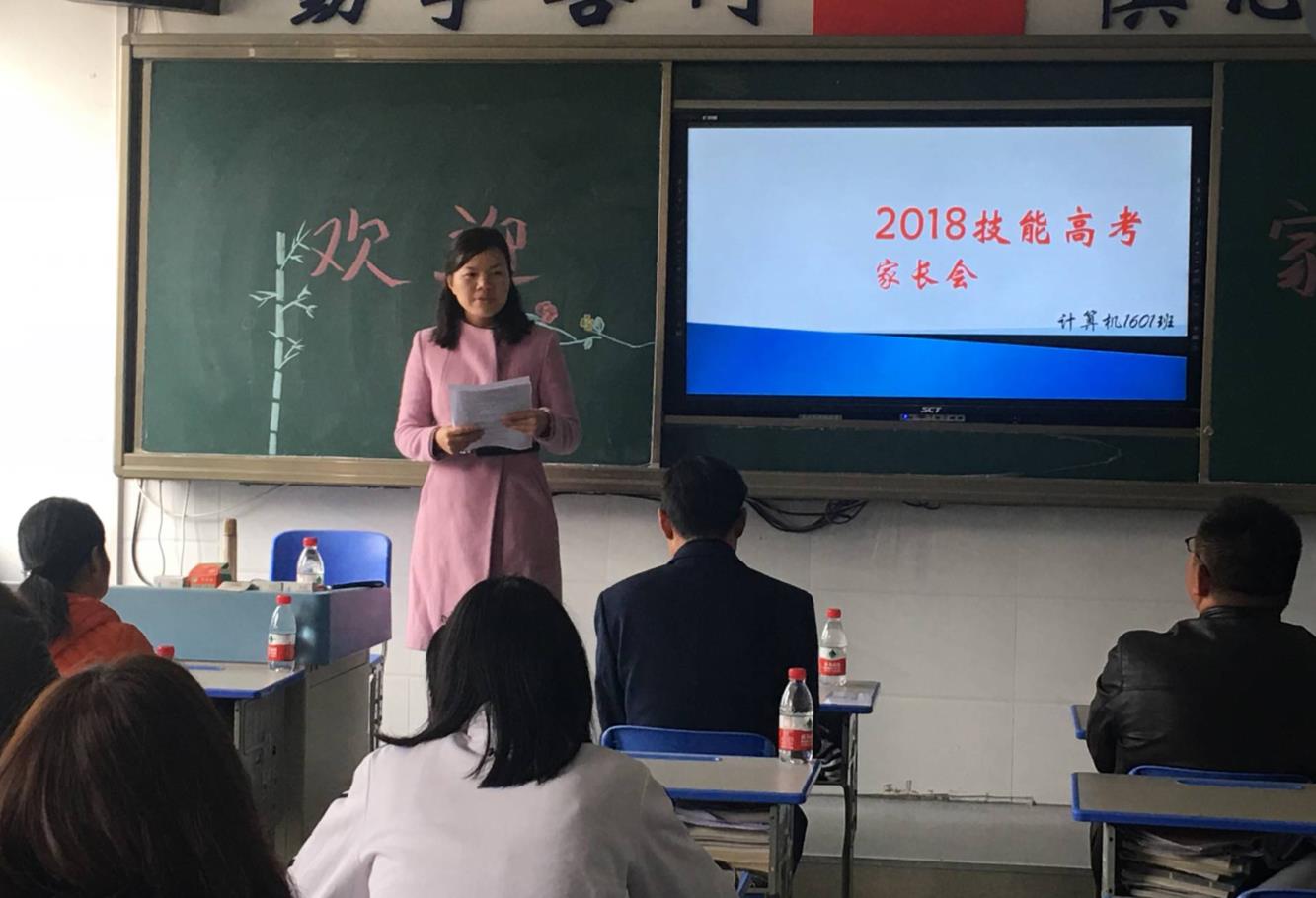为了使家长了解技能高考相关信息,了解学校的教育教学方法和学生的高三学习情况,家校配合,多方位助力学生备战高考,我校信息技术专业部张虹部长和计算机教研室蔡欢主任,在班主任卢燕玲老师的大力配合下,于2018年11月7日和11月12日,组织召开了计算机平面设计高考1601班、计算机高考1601班,两场高三年级学生家长会。
